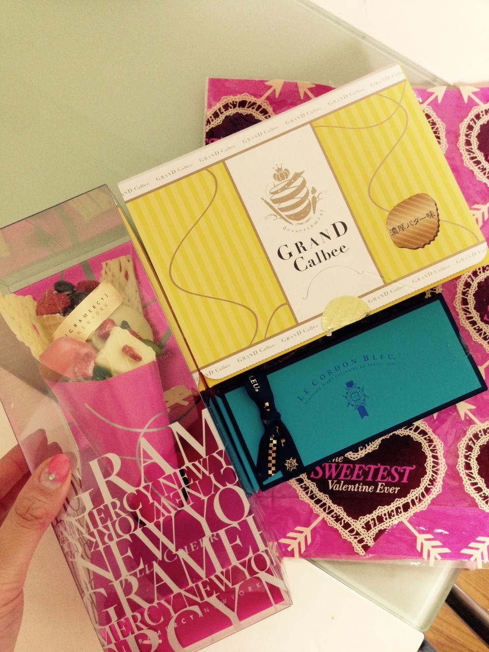 こんばんはManuCocoonの福嶋です(^_^) お客様からバレンタインのプレゼントいただいてしまいました♡ グランカルビーにグラマシーニューヨークにと旬なものやかわゆいもの!! 嬉しいー!!西心斎橋のプライベートネイルサロン♪ManuCocoon♡
