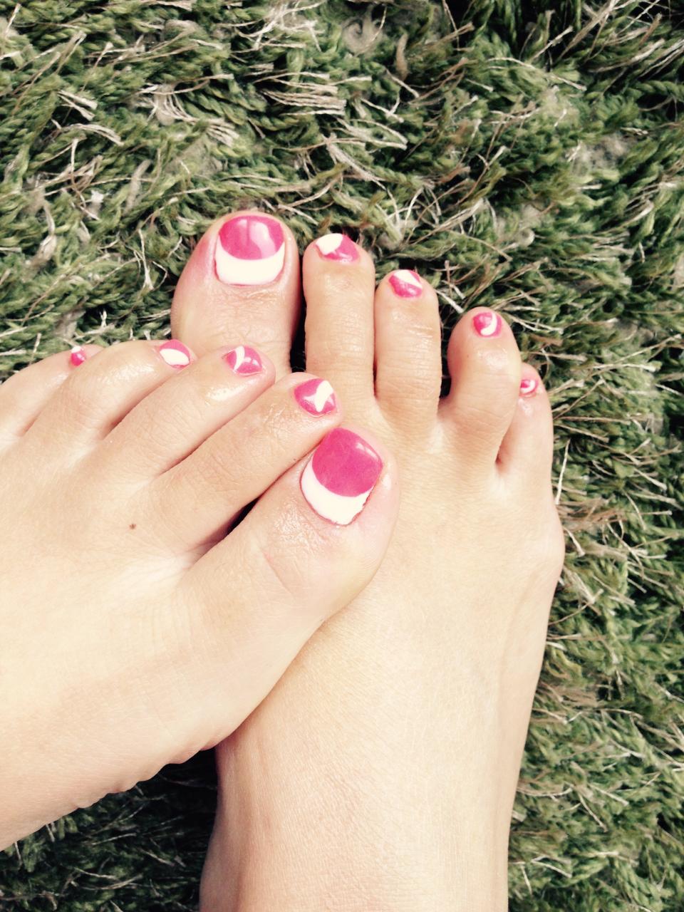 ManuCocoonの福嶋です♡ 温泉に行くのでお腹の肉と格闘しながらフットネイルをチェンジしました♪
